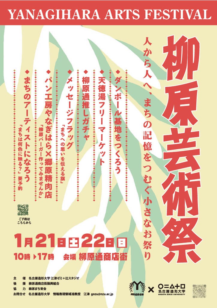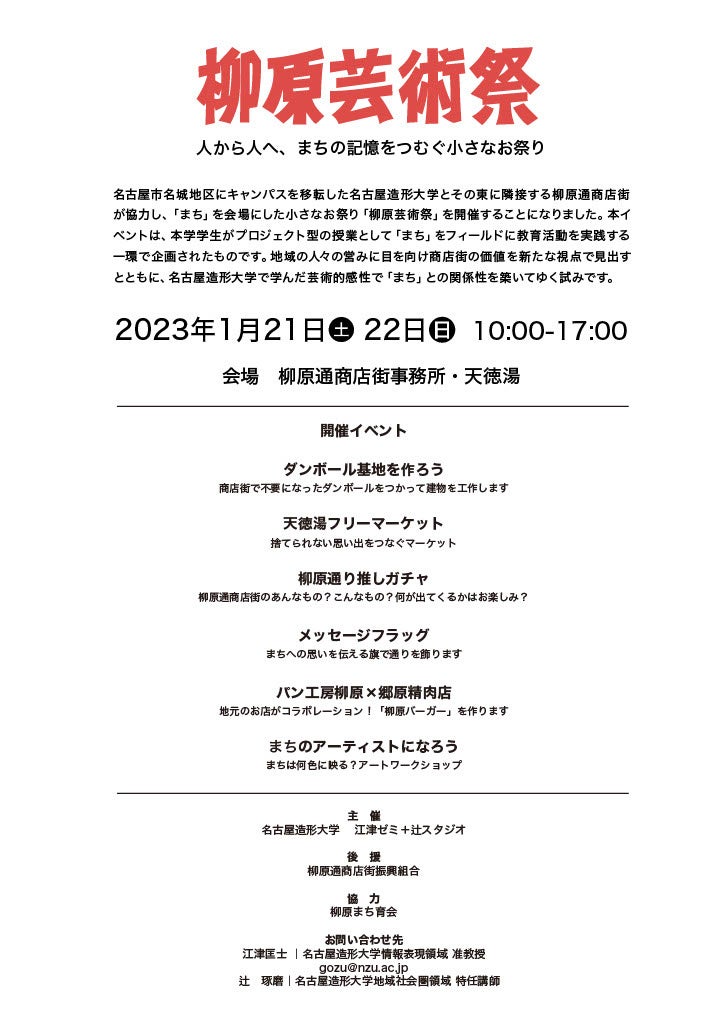 名古屋市名城地区にキャンパスを移転した名古屋造形大学とその東に隣接する柳原通商店街が協力し、「まち」を会場にした小さなお祭り「柳原芸術祭」を開催することになった。