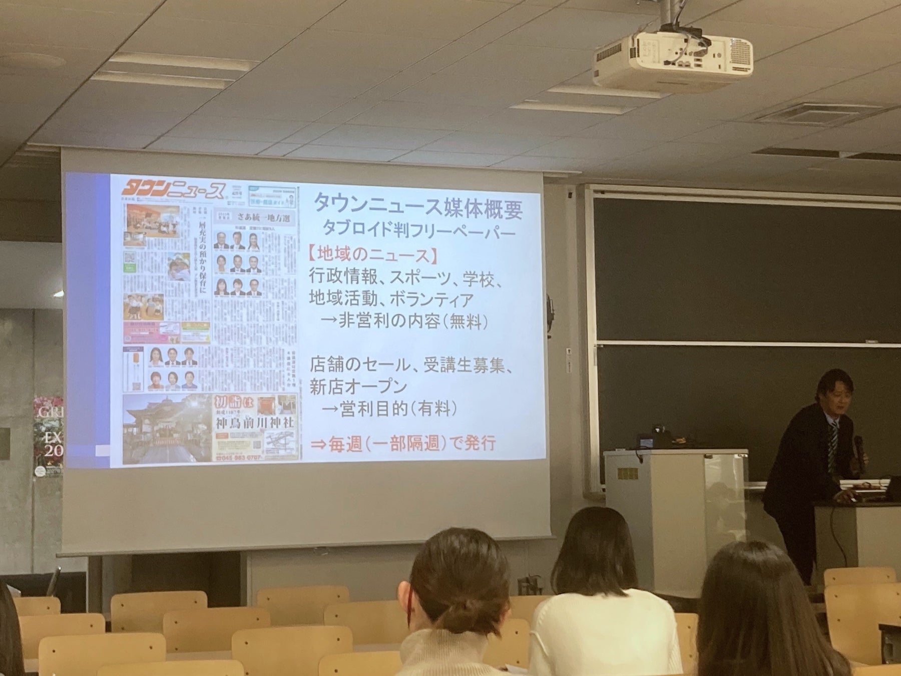 株式会社タウンニュース社のご担当者によるご講演の様子桐蔭横浜大学では、このような企業講演会のほか、職場見学会や企業セミナー等年間を通じてさまざまな就職支援を行っています。